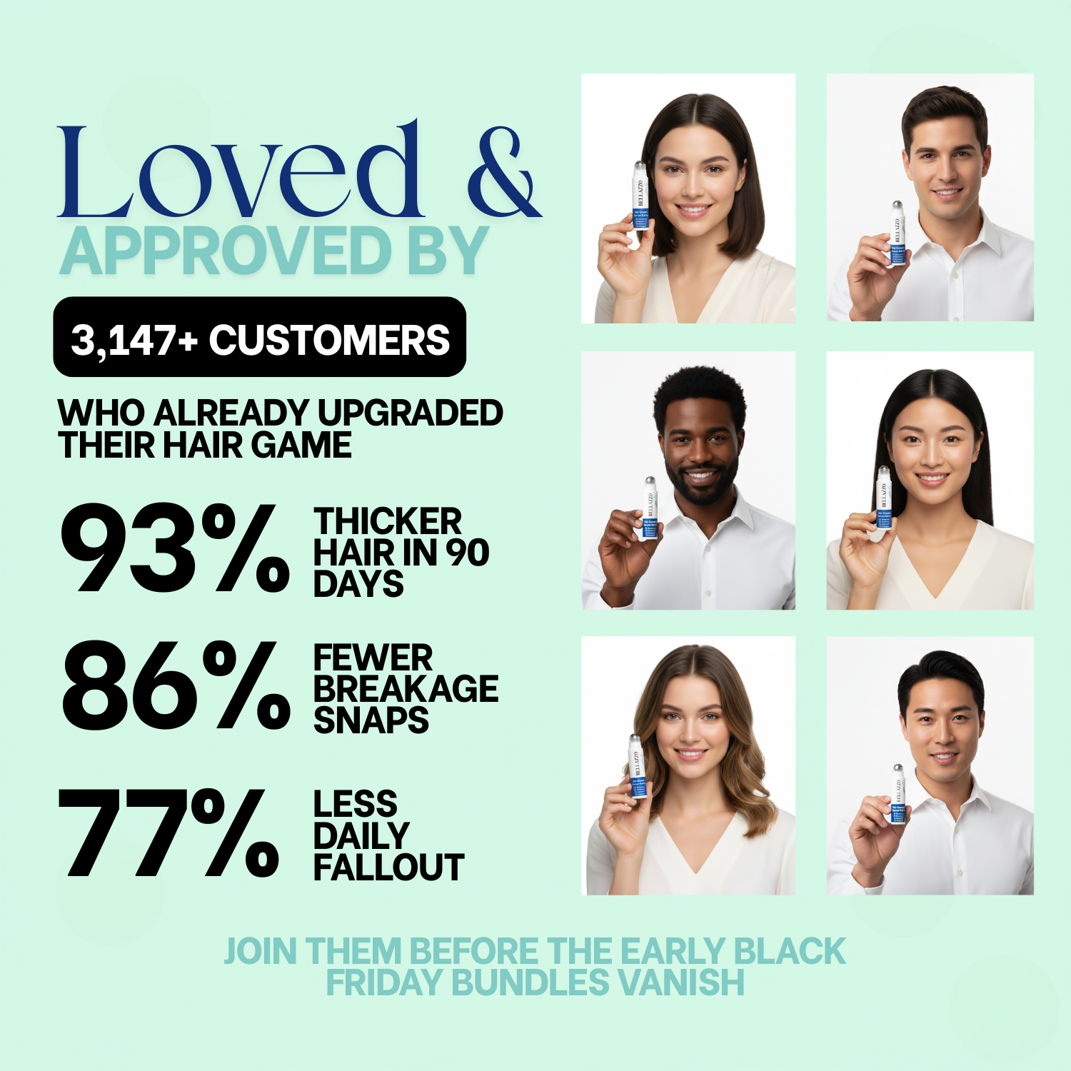 Most users see reduced shedding and baby hairs within 4 weeks of daily use. For the full transformation, including 93% fuller and thicker hair, continue for 90 days—results vary by individual scalp health and consistency.